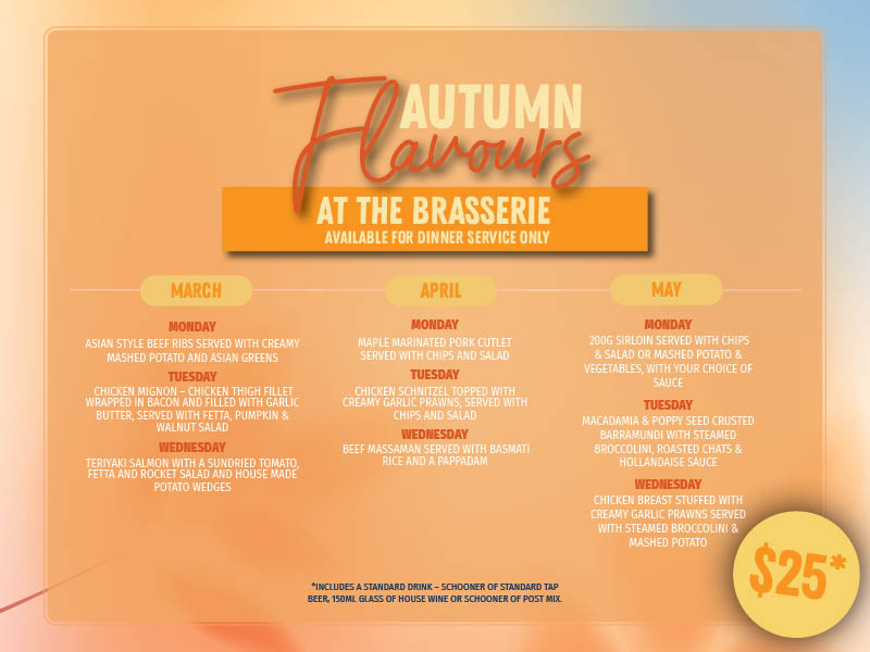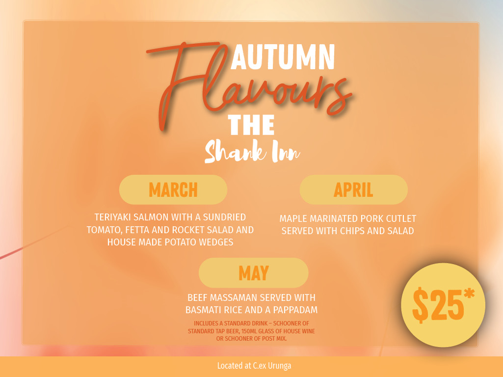 Available at C.ex Urunga every Thursday, March – May for dinner service only. Terms and conditions apply, includes a standard drink for members. Members only promotion. TP/00969