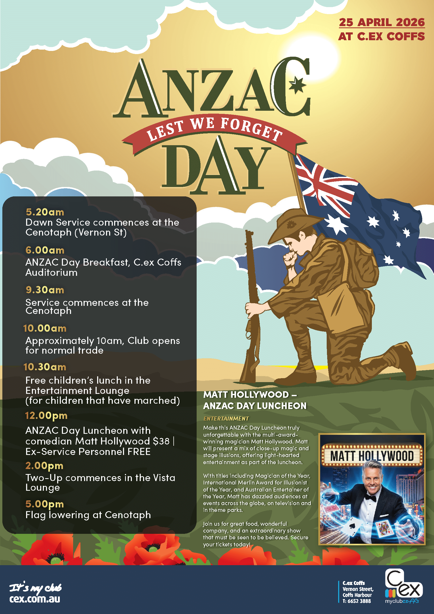 - 25 April – ANZAC Day – Dawn Service from 5:20am